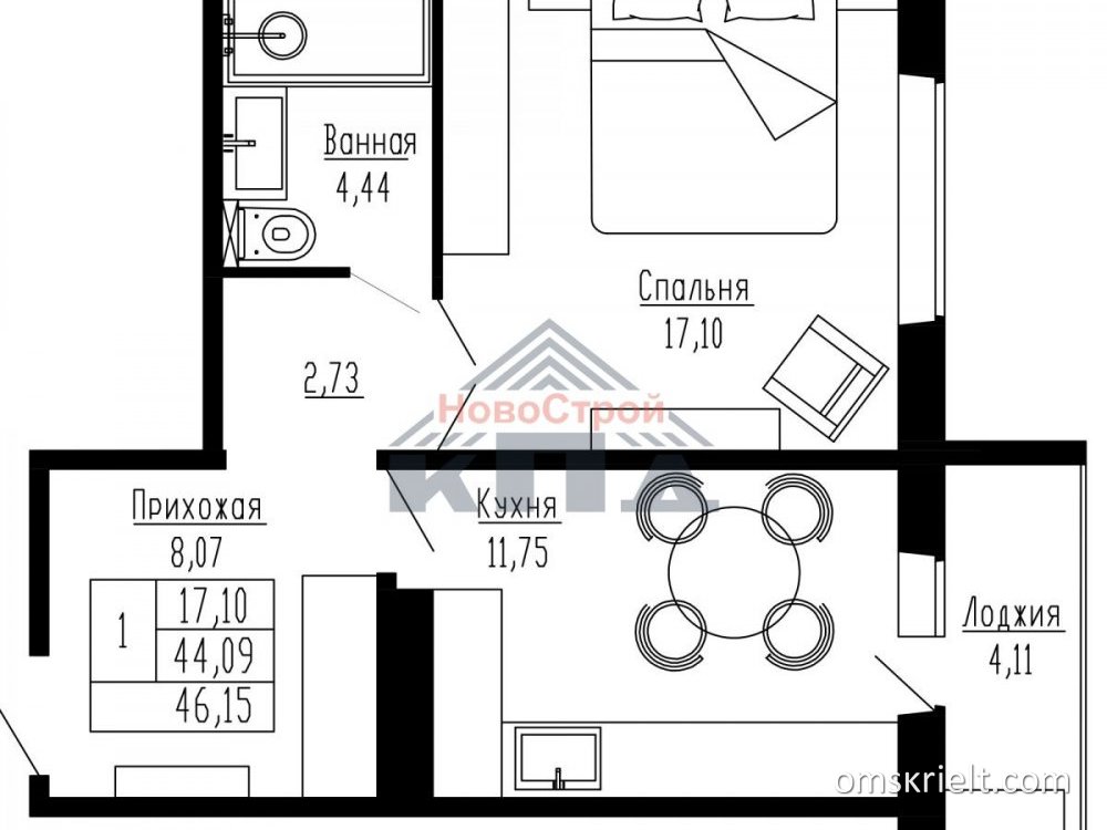 Продам 1-комнатную квартиру, 46.15 кв.м