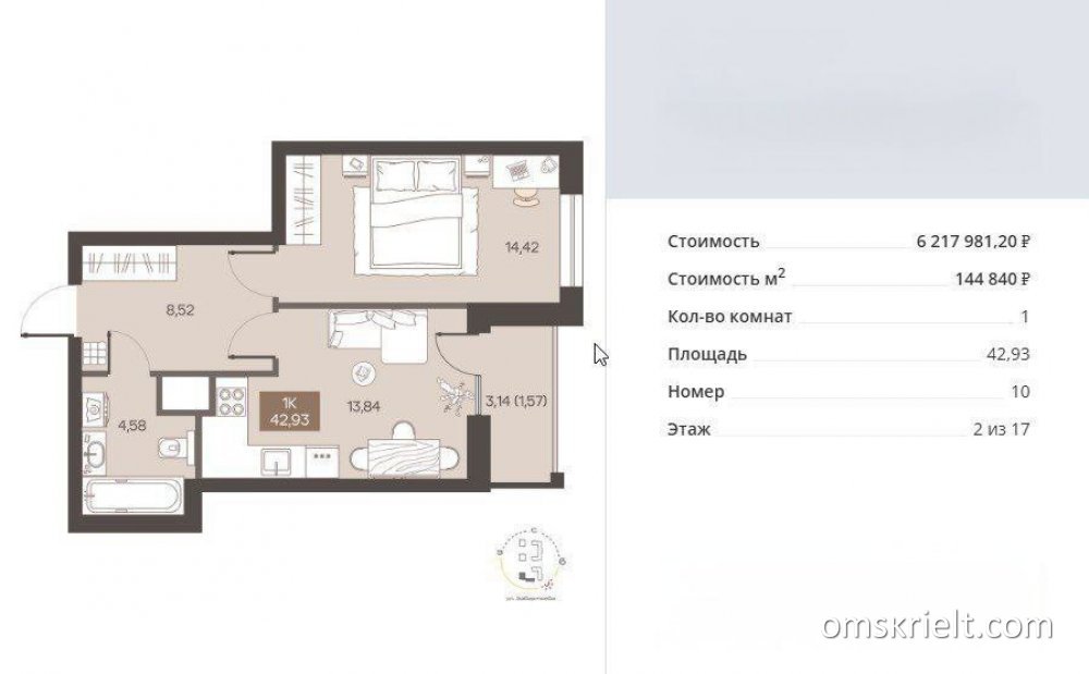 Продам 1-комнатную квартиру в Омске, 42.93 кв.м