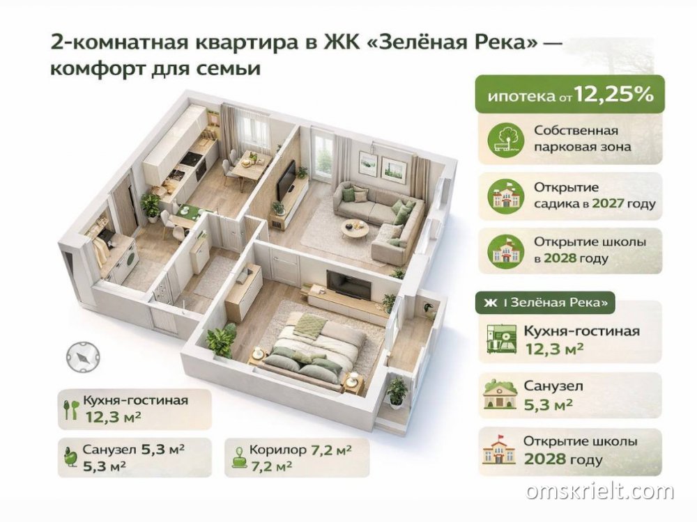 2-комнатная квартира в ЖК «Зелёная Река» — комфорт для жизни семьи Уникальное предложение для семей, которые ценят комфорт, пространство и развитую инфраструктуру. Продаётся полноценная двухкомнатная квартира в современном жилом комплексе «Зелёная Река». Планировка продумана для удобной жизни: кухня-гостиная — 12, 3 м² зал — 13, 4 м² спальня — 12 м² санузел (ванная) — 5, 3 м² коридор — 7, 2 м² Квартира отлично подойдёт для семьи с ребёнком: достаточно места для отдыха, работы и хранения. Выгодные условия покупки Возможность приобретения в ипотеку по ставке от 12, 25% — поможем с одобрением и подбором банка. Преимущества ЖК «Зелёная Река»: собственная парковая зона для прогулок и отдыха в 2027 году планируется ввод в эксплуатацию детского сада в 2028 году — строительство и открытие школы современная застройка и семейная атмосфера района Отличный вариант как для комфортного проживания, так и для долгосрочного вложения. Звоните или пишите — с удовольствием расскажу подробности и подберу удобное время для консультации Арт. 131445585
